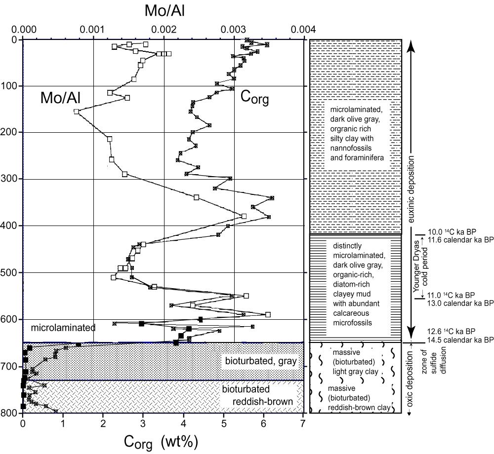 Mo/Al vs Total Organic Carbon (weight %) from ODP site 1002 (Cariaco Basin)